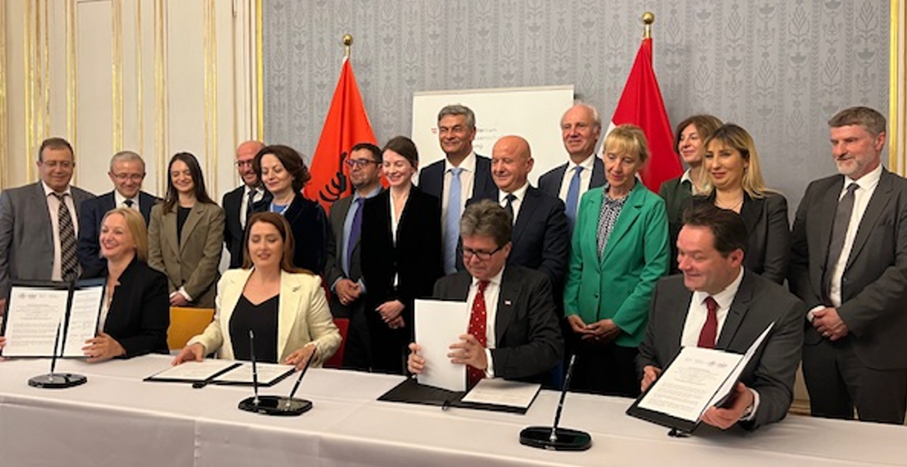 Signing ceremony with the Albanian Ministers of Education & Science and Agriculture (left front) and the Austrian Ministers of Science & Research and Agriculture (right front).